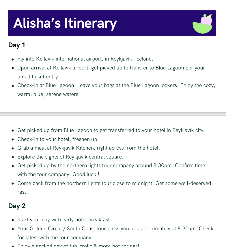 -My complete daily Itinerary.