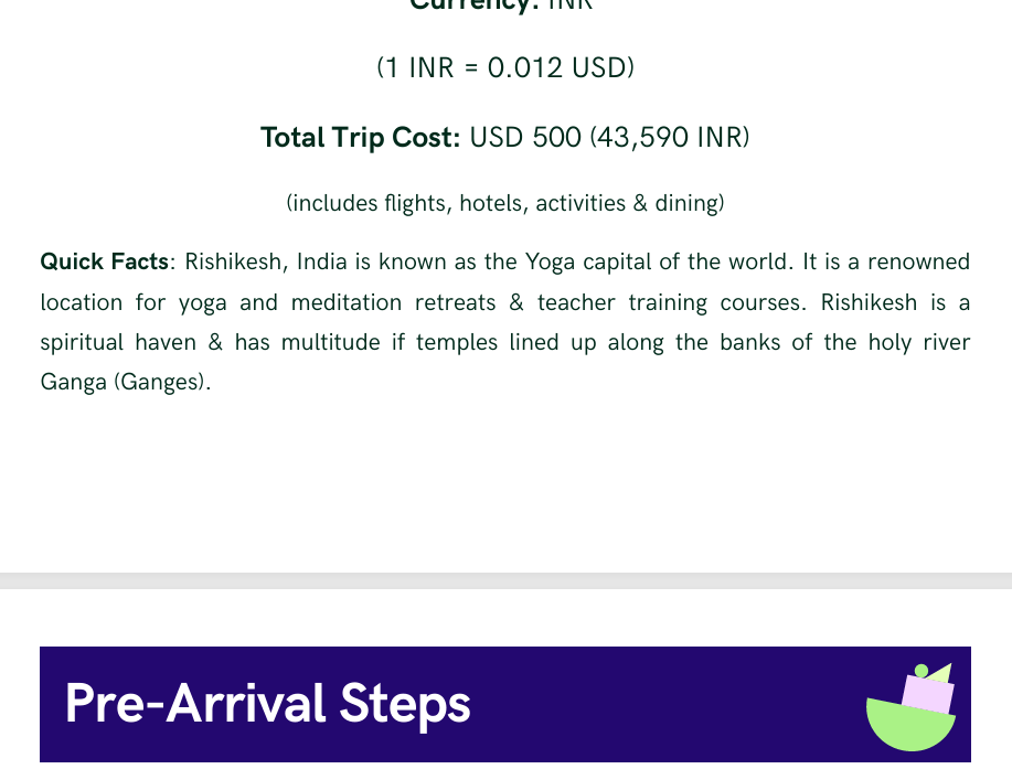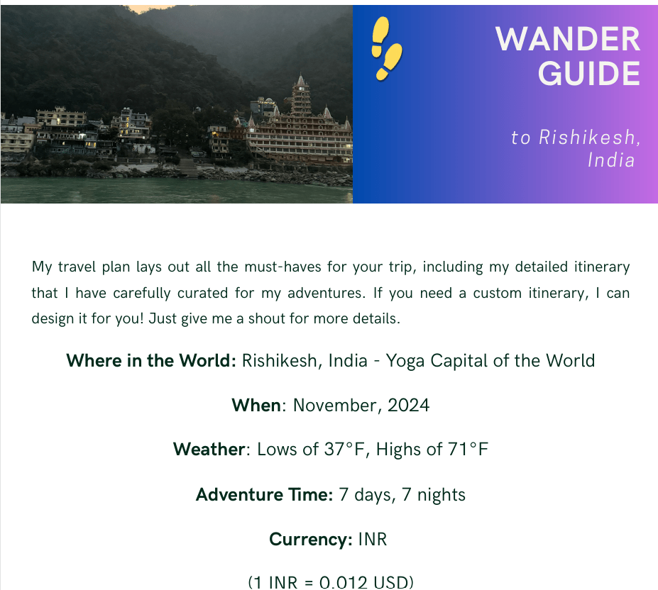 | Customized Travel Guides tailored for You: Have specific preferences or unique needs? I can create a personalized travel guide tailored just for you. Reach out to discuss your requirements and get a customized quote | Contact for quote |